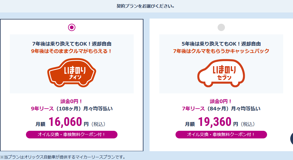 利用できるカーリースプランはオリックス自動車の「いまのりセブン」と「いまのりナイン」となっています。